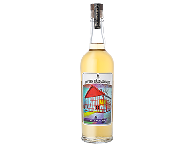Tveten Gård Aquavit med etikettens forsidebilde i original i bakgrunnen.
