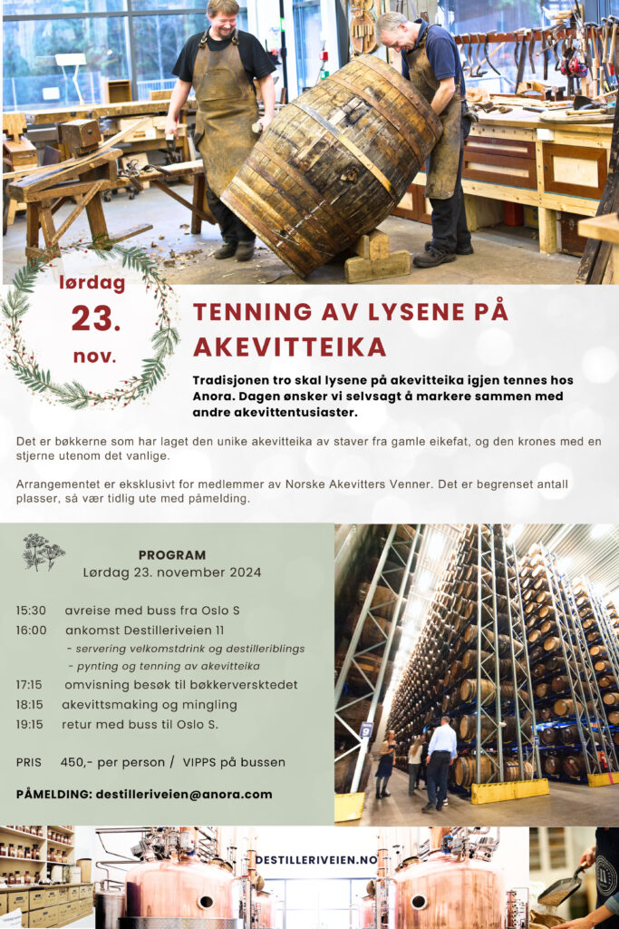 Det er snart jul (!) og tradisjonen tro tennes Akevitteika på Gjelleråsen utenfor Oslo. Tenningen skjer lørdag 23. november 2024 og medlemmer i Norske Akevitters Venner får her en eksklusiv invitasjon til å overvære tenningen av treet, som er laget av fatstaver fra gamle akevittfat.
