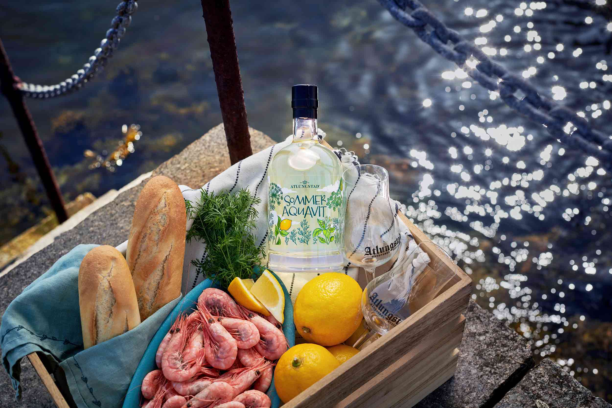 Jo lettere mat, jo lysere bør akevitten være. Derfor har Atlungstad Håndverksdestilleri nå utviklet en egen Sommer Aquavit. Akevitten er laget av sprit fra norske poteter og er smaksatt med dill og krondill fra Skjærgård gartneri i Vestfold. Skall fra 70 kg økologiske sitroner er også brukt til å gi akevitten lette og friske toner og behagelig ettersmak, og disse ble skrelt for hånd.