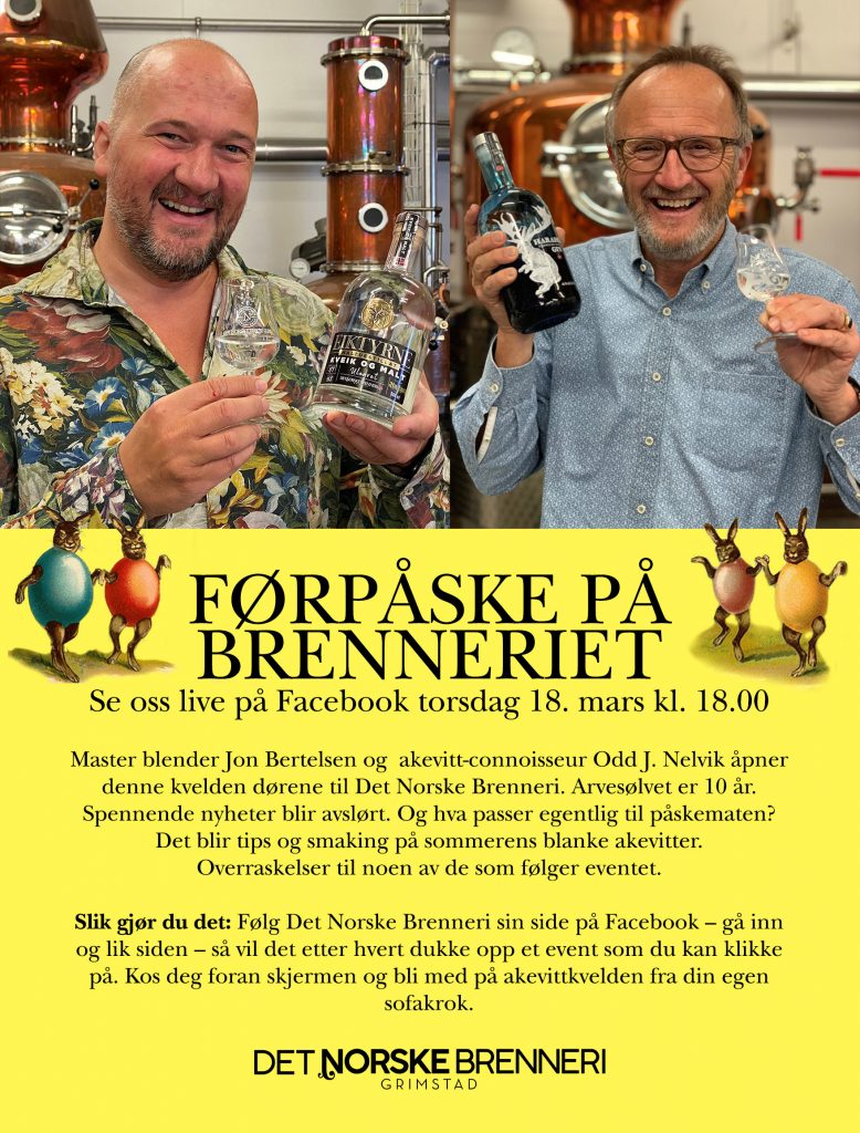 Torsdag 18. mars 2021 kl. 18:00 er det igjen «direktesending» fra Det Norske Brenneri i Grimstad på Facebook.