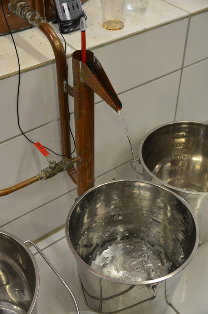 Nydestillert akevitt hos Egge Gård i Lier. Nå gjenstår bare minst seks måneder på brukte sherryfat.