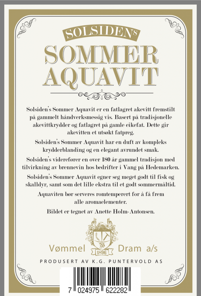 Sommerakevitten fra Vømmel & Dram fyller fire år i år. Akevitten er en klassisk krydret Aquavit med karve som hovedkrydder. Solsidens har ikke dill i krydderbildet slik som mange andre har i dette segmentet.