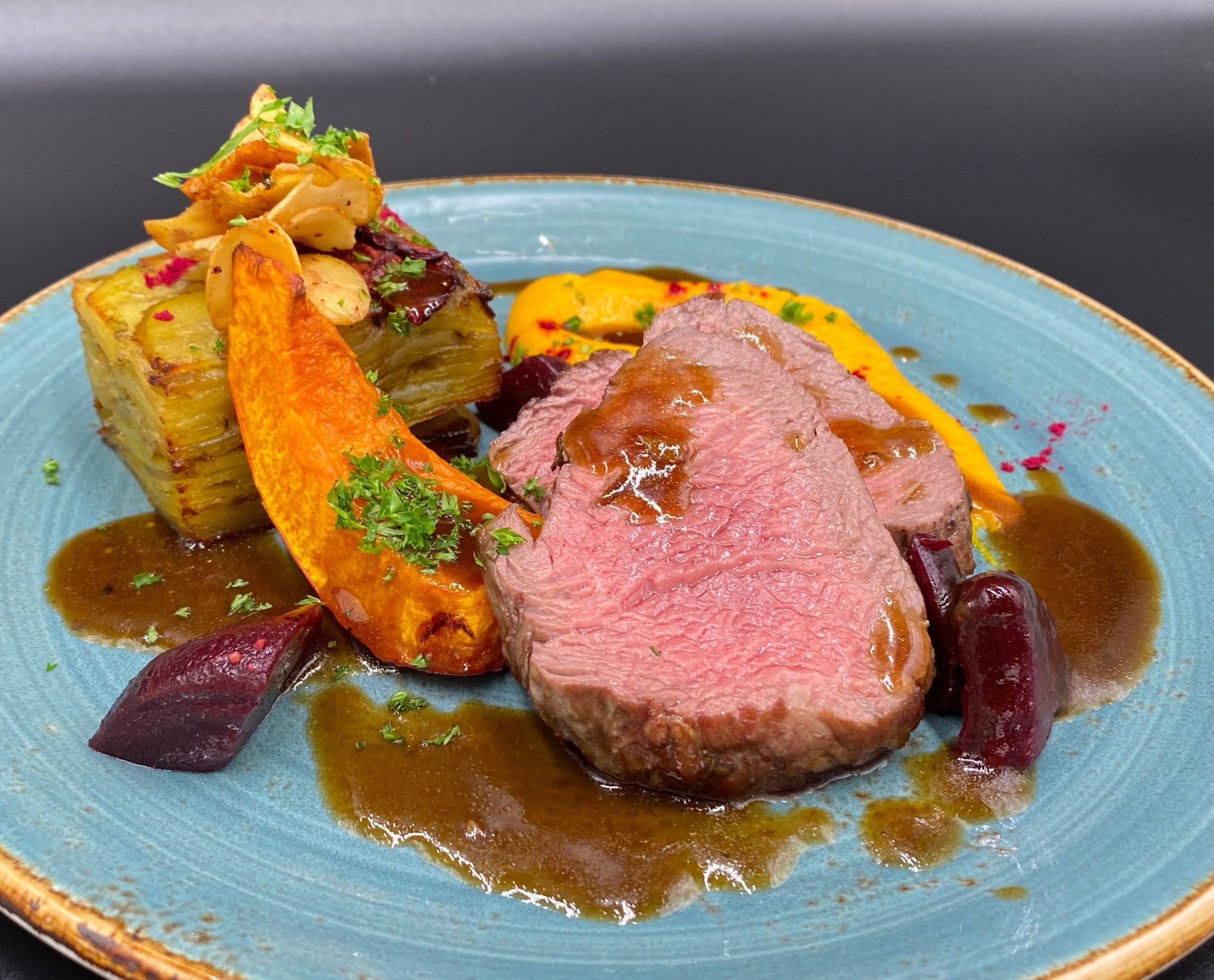 Rosastekt mørbrad av lam, gulrotkrem, Hokkaido-gresskar og saltbakte rødbeter samt pommes Anna og trøffel-glace
