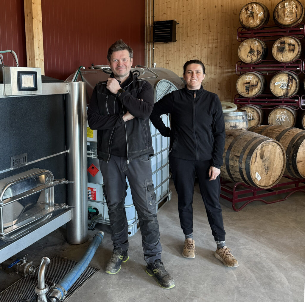 Bernt Gran og destillatør Anika Perisic kan fortelle at de i tillegg til dill fra Ringerike har smakssatt akevitten med jordbær, bringebær, fennikel, sitronskall og karve – sistnevnte fra Inderøy.